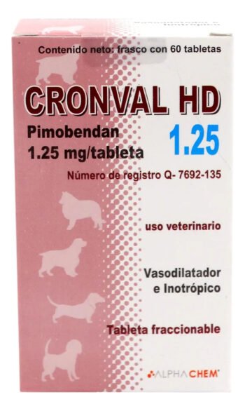 Características: CRONVAL HD está indicado para el tratamiento de la falla cardiaca congestiva, la cual es secundaria a la enfermedad valvular cardiaca crónica y a la cardiomiopatía dilatada en perros. Principio Activo: Pimobendán 1.25mg