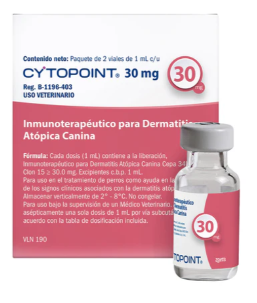 CYTOPOINT® es un líquido estéril, listo para usar, que contiene un anticuerpo monoclonal caninizado (mAb) contra la interleucina-31 (IL-31). Estudios de laboratorio han demostrado que la IL-31 induce prurito en perros. CYTOPOINT permanece en la circulación durante varias semanas. Ejerce un efecto terapéutico al enlazar y neutralizar a la IL-31 soluble, inhibiendo así el prurito y reduciendo las lesiones en la piel. Al igual que otros anticuerpos y complejos anticuerpo-antígeno naturales, su eliminación es por las vías normales de degradación de las proteínas. CYTOPOINT ayuda en la reducción de los signos clínicos asociados con la dermatitis atópica en perros.