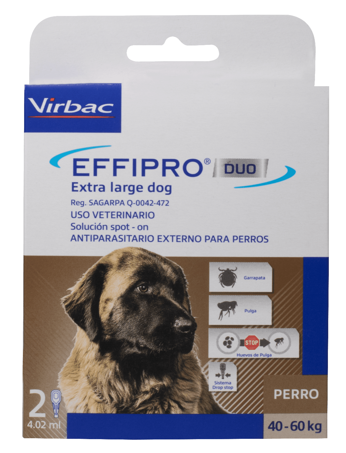 EFFIPRO DUO exlarge dog. antiparasitorio, esta indicado en perros de 40 a 60 kg contra infestaciones de pulgas y garrapatas. Contra pulgas: Tratamiento y prevención de infestaciones por pulgas (Ctenocephalides canis). Un tratamiento previene futuras infestaciones por 7 semanas. Prevención de la multiplicación de pulgas mediante prevención del desarrollo de huevos a pulgas adultas por 12 semanas después de la aplicación. El producto puede ser usado como parte de un tratamiento estratégico para el control de Dermatitis Alérgica por Picadura de Pulga (DAPP) cuando ésta ha sido previamente diagnosticada por un Médico Veterinario. Contra garrapatas: Tratamiento de infestaciones por garrapatas. Un tratamiento provee eficacia acaricida persistente por 4 semana contra Rhipicephalus sanguineus (garrapata café del perro). Si las garrapatas están presentes al tiempo de la aplicación, no todas las garrapatas morirán dentro de 48 horas. Fipronil 402mg Piriproxifen 120,6mg