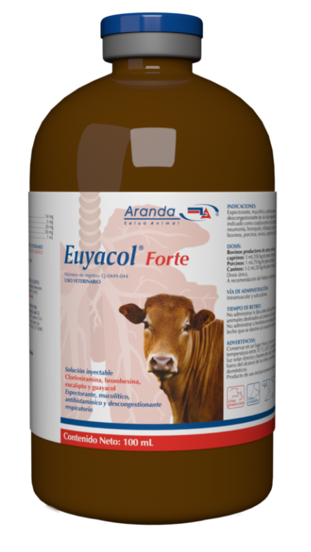 Expectorante, mucolítico, antihistamínico y descongestionante de las vías respiratorias, indicado como coadyuvante en el tratamiento de neumonía, bronquitis, influenza, tos y catarro en bovinos productores de carne, porcinos, ovinos, caprinos y caninos.