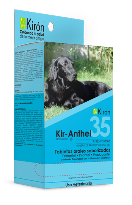 Kir-Anthel 35 es un desparasitante de amplio espectro, para el tratamiento y la prevención de nematodos (lombrices redondas) en sus fases adultas, larvarias y de huevos, cestodos (tenias) y protozoarios (amibas) de los perros.