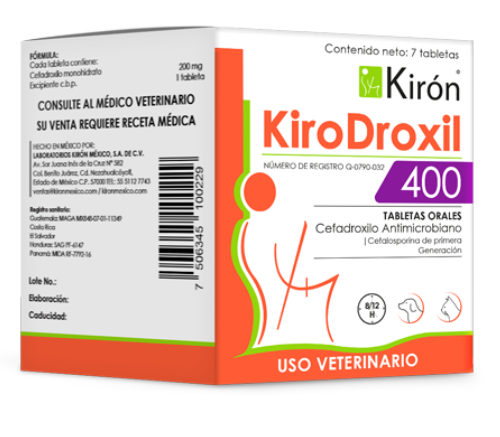 KiroDroxil 400 contiene cefadroxilo una cefalosporina semisintética de primera generación, con efecto bactericida de amplio espectro. Esta indicado en infecciones respiratorias, cutáneas, tejidos blandos, genitourinarias, oído medio e interno, osteomielitis, discoespondilitis y poliartritis bacterianas.