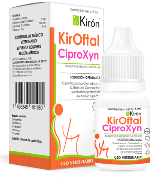 KirOftal Ciproxyn está indicado para el tratamiento de infecciones externas del globo ocular como conjuntivitis bacteriana y úlceras corneales causadas por microorganismos Gram positivos y Gram negativos susceptibles. El condroitín sulfato al 20% acelera la regeneración y la organización epitelial del estroma corneal.