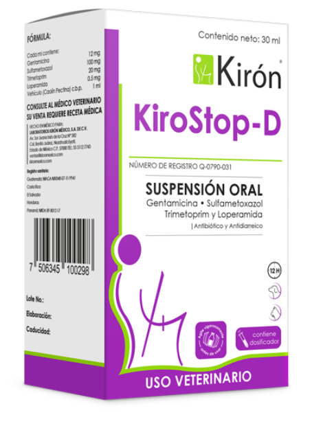 KiroStop-D. Antidiarreico y antimicrobiano de amplio espectro útil en infecciones causadas por microorganismos Gram positivos, Gram negativos como; Escherichia coli, Pasteurella spp, Klebsiella spp, Pseudomona spp, Proteus spp, Campylobacter spp, Vibrio spp, Treponema spp y Clostridium spp, así como en algunas infecciones por protozoarios: Trichomonas, Isospora y Eimeria micoplasmas y riquettsias sensibles a la acción de la fórmula.