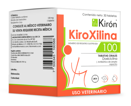 KiroXilina 100 es un antibiótico semisintético del grupo de las tetraciclinas de amplio espectro que actúa contra las bacterias Gram-positivas y Gram-negativas, aerobias y anaerobias controla bien las enfermedades causadas por rickettsias, Ehrlichiosis canina, clamidias y micoplasmas. KiroXilina 100 está indicada para el tratamiento de infecciones: del tracto respiratorio (rinitis, amigdalitis y bronconeumonía), del sistema urogenital (cistitis, metritis y prostatitis); de la piel (dermatitis supurativas, abscesos y heridas infectadas).