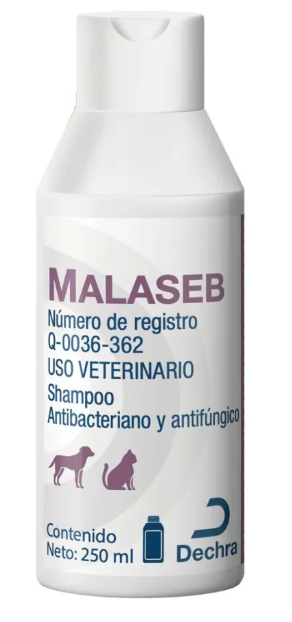 Malaseb Shampoo de Dechra es un shampoo medicado indicado para el tratamiento de dermatitis causadas por hongos y bacterias en perros y gatos.