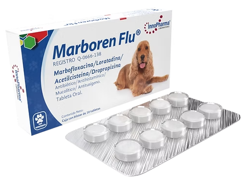 Marboren Flu® está indicado para el tratamiento de infecciones del tracto respiratorio, proporcionando un efecto mucolítico, antihistamínico, antibiótico y antitusígeno, principalmente para infecciones que presentan resistencia bacteriana a otros antibióticos y como primera elección para la Traqueobronquitis infecciosa canina (tos de las perreras) provocada por Bordetella bronchiseptica.