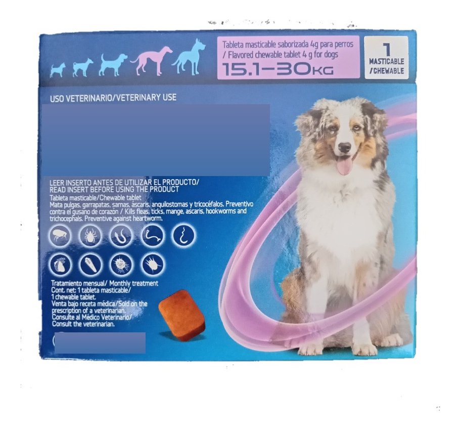 Características: Controla el más amplio espectro de parásitos, con un solo masticable sabroso que los perros prefieren. Elimina pulgas, garrapatas y parásitos internos. Vía oral. 1 tableta masticable una vez por mes. Principio Activo: NEXGARD SPECTRA 9 mg/ 2 mg