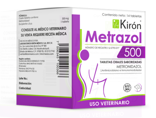 Metrazol 500. Antimicrobiano e inmunomodulador. Medicamento de elección contra infecciones por Giardia spp en cachorros. Útil cuando se presentan diarreas y flatulencias producidas por microorganismos bacterianos sensibles a la fórmula. Así mismo, se recomienda en caso de síndrome de intestino corto, infecciones anaerobias de la cavidad oral, encefalopatía hepática, colangitis y enfermedad inflamatoria intestinal.