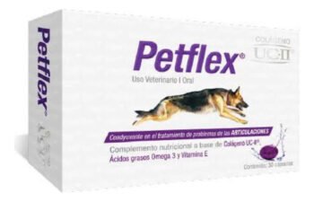 Características: Petflex Condroprotector indicado en la artritis de perros y gatos | actúa sobre la articulación dañada, por mediación del sistema inmunológico, regenerando el cartílago. Mejora la movilidad y flexibilidad, reduciendo significativamente el dolor articular. El UC-II es un colágeno tipo II sin desnaturalizar derivado del cartílago del esternón de pollo. El colágeno tipo II es la principal proteína estructural del cartílago y representa aproximadamente el 50% de la matriz extracelular del cartílago. Ayuda en el tratamiento de problemas de las articulaciones por el deterioro del cartílago, caracterizado por dolor y pérdida de movilidad. Principio Activo: Colageno UC-II 40mg Acidos Grasos Omega 3 157.14mg De los cuales: EPA (Ácido eicosapentaenoico) 78.57mg DHA (Ácido Docosahexaenoico) 31.43mg Vitamina E (Acetato de dl-alfa-tocoferol) 21UI Excipiente cbp 1 capsula