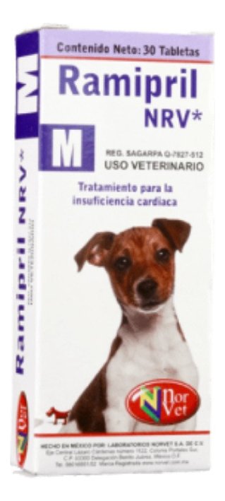 Características: RAMIPRIL PLUS NRV está indicado para el tratamiento de la insuficiencia cardiaca congestiva en perros (clase funcional NYHA-II-IV) Principio Activo: Tabletas orales, Ramipril “m” 1.25mg 1 tab- 5 a 10kg 30 tbs