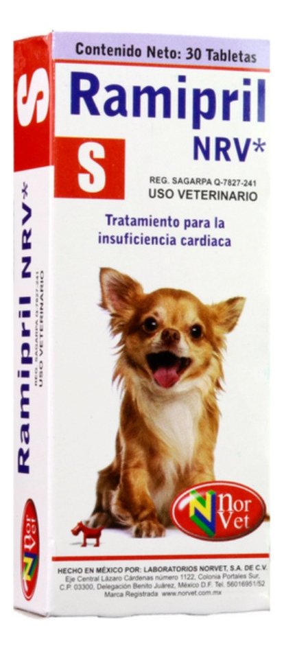Características: RAMIPRIL NRV está indicado para el tratamiento de la insuficiencia cardiaca congestiva en perros (clase funcional NYHA-II-IV). Principio Activo: Cada tableta contiene 0.625 mg Excipiente c.b.p. 1 tableta