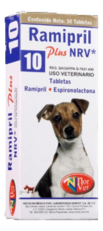 RAMIPRIL PLUS 10 NRV* es un Inhibidor de la Enzima Convertidora de la Angiotensina (IECA) que actúa como vasodilatador mixto el cual está indicado para el tratamiento de la la Insuficiencia Cardiaca Congestiva causada por Insuficiencia Valvular (Endocarditis) o Cardiomiopatía en Perros.
