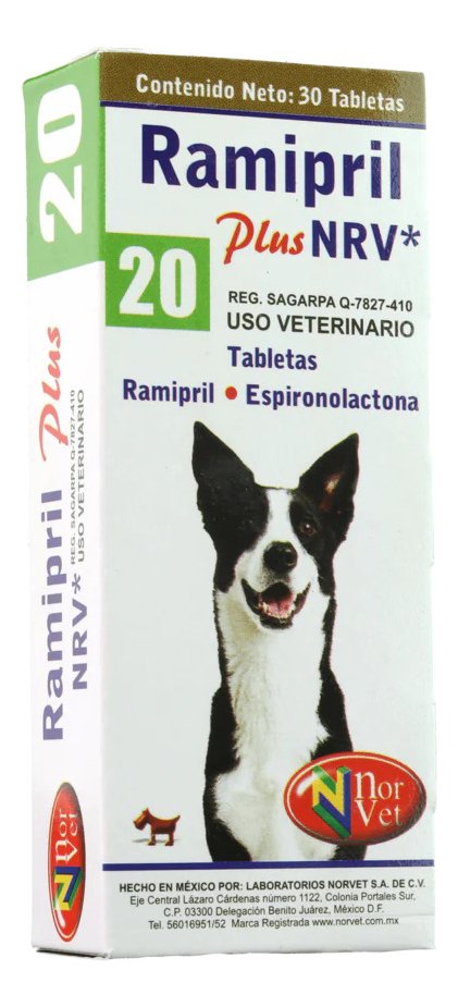 RAMIPRIL PLUS 20 NRV* es un Inhibidor de la Enzima Convertidora de la Angiotensina (IECA) que actúa como vasodilatador mixto el cual está indicado para el tratamiento de la la Insuficiencia Cardiaca Congestiva causada por Insuficiencia Valvular (Endocarditis) o Cardiomiopatía en Perros.