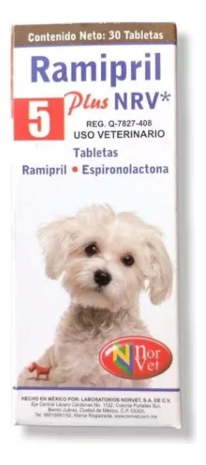 RAMIPRIL PLUS 5 NRV* es un Inhibidor de la Enzima Convertidora de la Angiotensina (IECA) que actúa como Vasodilatador mixto el cual está indicado para el tratamiento de la la Insuficiencia Cardiaca Congestiva causada por Insuficiencia Valvular (Endocarditis) o Cardiomiopatía en Perros.