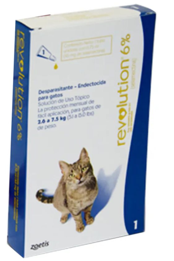 DESPARASITANTE-ENDECTOCIDA TÓPICO PARA GATOS, Selamectina es un compuesto semisintético perteneciente a las avermectinas.Para el tratamiento tópico (dérmico) de gatos de no menos de seis semanas de vida. Revolution®, aplicado mensualmente, está indicado para el tratamiento y control de las infestaciones por pulgas (especies de Ctenocephalides), el control de las microfilarias del parasito Dirofilaria immitis (nematodo del corazón) y el tratamiento y control de los acaros de las orejas (Otodectes cynotis) y los piojos (Trichodectes canis y Felicola subrostratus) en gatos . Revolution® está también indicado para el tratamiento y control de los anquilostomas (Ancylostoma tubaeforme) y los nematodos intestinales (Toxocara cati) en gatos. Revolution® se aplica tópicamente a la piel a la dosis mínima recomendada de 6 mg de Selamectina por Kg de peso corporal, una vez al mes