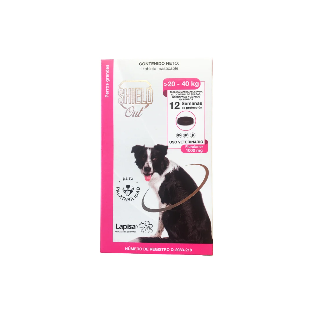 Acaricida e insecticida sistémico. Shield-Out® es un acaricida e insecticida sistémico de acción inmediata indicado para controlar las infestaciones por ectoparásitos (garrapatas y pulgas) en perros por un periodo de 12 semanas. Es efectivo contra la garrapata Rhipicephalus sanguineus (larvas, ninfas y adultas) y pulgas (Ctenocephalides canis). Shield-Out® está recomendado para el tratamiento de la demodicosis causada por Demodex spp., en perros.