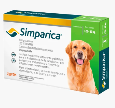 Simparica tabletas masticables elimina pulgas adultas y está indicada para el tratamiento y prevención de infestaciones de pulgas (Ctenocephalides felis y Ctenocephalides canis) y para el tratamiento y control de infestaciones de garrapatas (Rhipicephalus sanguineus). Amblyomma americanum, Ablyomma cajennense, Amblyomma maculatum. Dermacentor variabilis, Dermacentor reticulatus, Ixodes scapularis, Ixodes ricinus, Ixodes holocyclus, Ixodes hexagonus, Haemaphysalis longicornis). Simparica provee una inmediata y persistente eliminación de las pulgas y garrapatas por al menos 5 semanas.