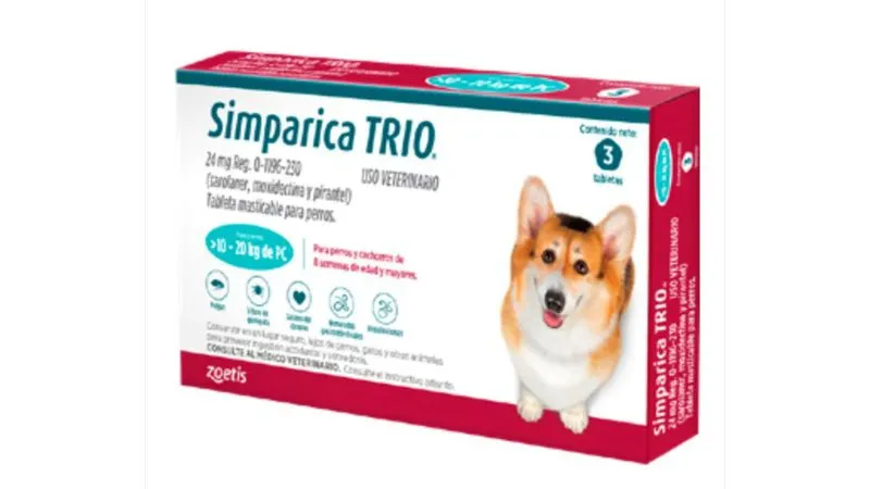Simparica TRIO® (sarolaner, moxidectina y pirantel)ECTOPARASITICIDA es una tableta masticable saborizada para ser administrada a perros de 8 semanas de edad y mayores. Cada tableta está formulada para administrar dosis mínimas de 1.2 mg de sarolaner/kg de peso corporal, 0.024 mg de moxidectina/kg de peso corporal y 5 mg de pirantel (como sal de pamoato)/kg de peso corporal.